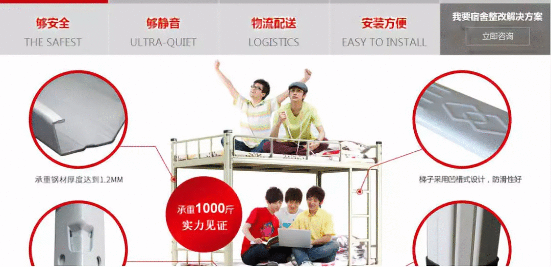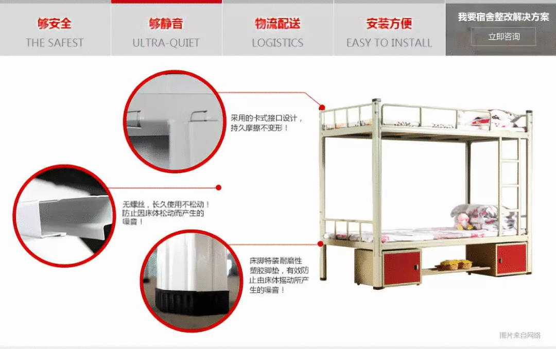在基本需求后,連盈家具把其鐵架床“夠靜音”與同行差異化出來,“3分鐘能快速安裝好的宿舍床”等“安裝方便”的特點;與同行或者同類產品相比,更是獨勝一籌,連盈宿舍床產品競爭力一下突顯出來!