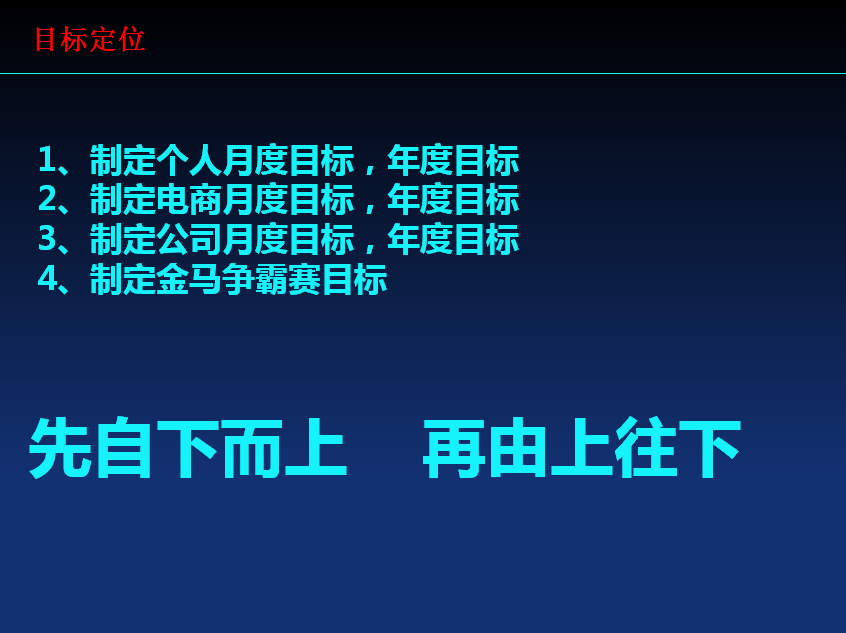數據的來源主要來自于長期網銷工作中的數據,尤其是爭霸賽的網銷數據,要對這些數據進行收集、分類、整理并作出分析、處理,好的數據持續(xù)加強,不好的,要作出改進。有了數據,才能將企業(yè)目標進行分解,制定出每周的關鍵詞計劃、推廣計劃并下發(fā)到各崗位,令其有序、高效地完成每周計劃,從而幫助企業(yè)達成業(yè)績目標。